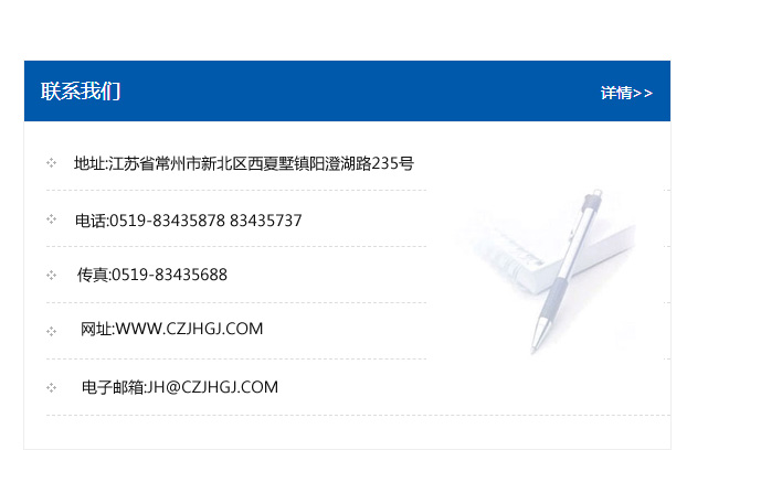 地址:常州市新北區友邦商務大廈1幢16、17層  電話:0519-85101652  傳真:0519-85112595  郵編:213022  網址:www_cz-jiayue_cn.03xq.com  郵箱:xiajifengaa@163.com